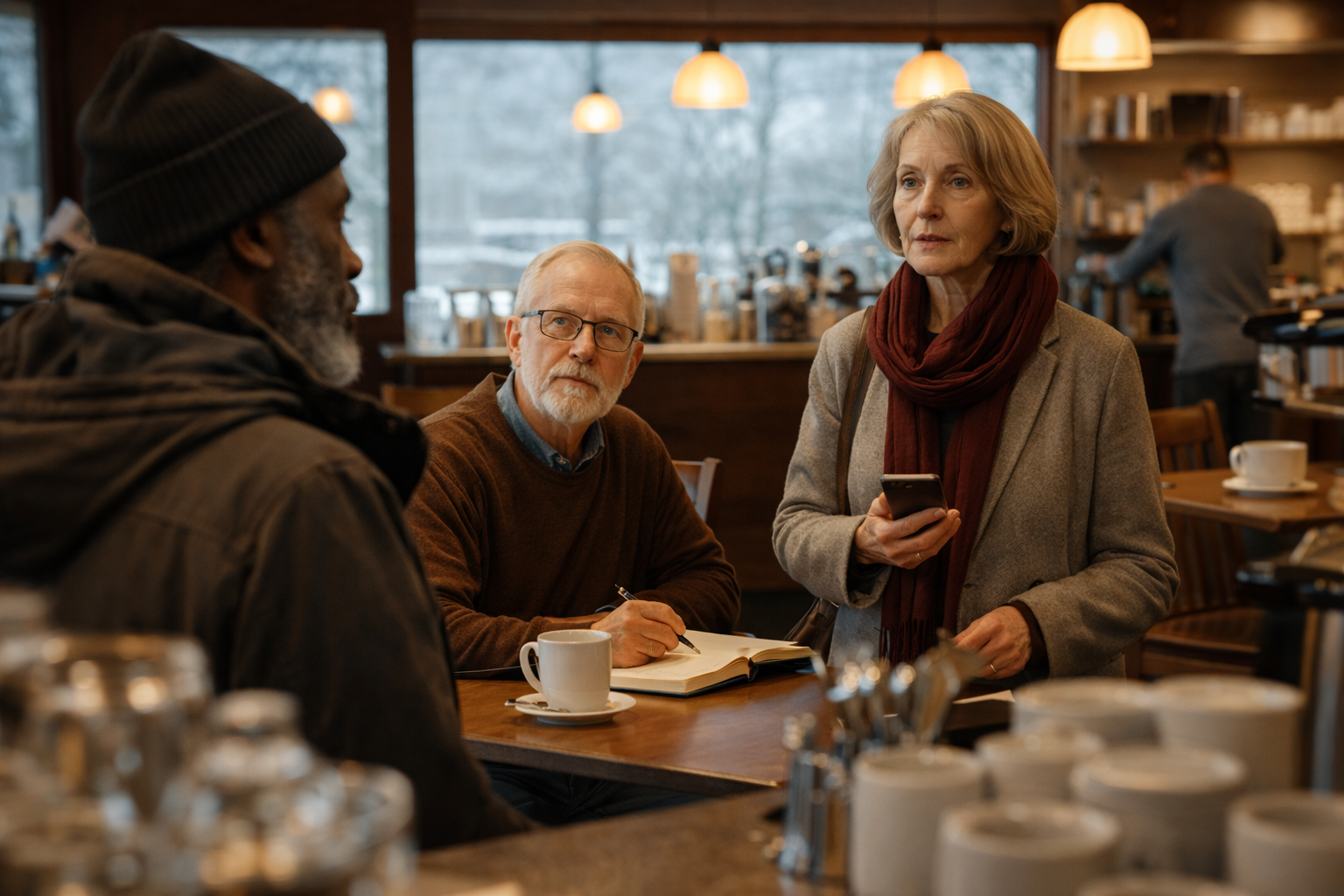 Inside, the place was busy in a quiet way—steam rising from cups, jazz sliding beneath conversation, the espresso machine punctuating everything like a metronome. Barbara moved through it with purpose, scarf tucked neatly at her neck, and found Elijah and Jeremiah already at their usual table.