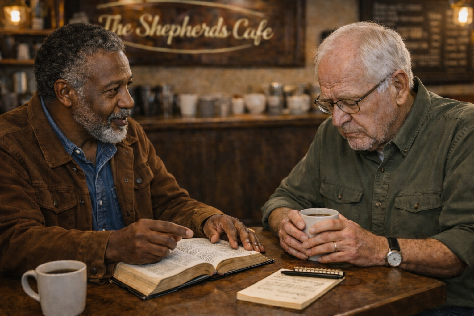 Jeremiah found him in the back corner of The Shepherds Cafe, the quiet side where the light was softer and the noise didn’t chase you. The man sat with both hands wrapped around a mug he wasn’t drinking. His shoulders were broad, but they sagged like a porch beam that had held too much weight for too many seasons.
