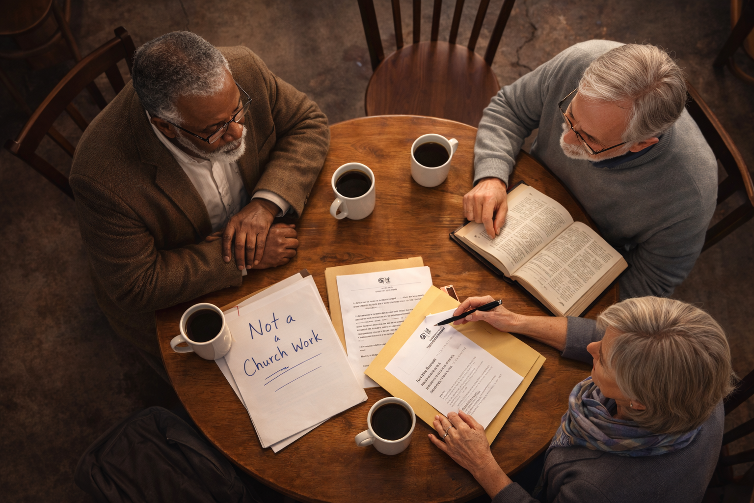 A warm, realistic interior scene inside The Shepherds Cafe. Jeremiah (older Black man, salt-and-pepper beard) is already seated at a corner table with his coat folded on a chair; Elijah (older man with short white beard and glasses) has just set down an open Bible and a manila folder; Barbara (older white woman with short blonde/gray bob and scarf) has just arrived and is placing a sealed envelope with a state letterhead and a pen on the table. The mood is serious, focused, and faithful. Background: espresso counter softly blurred, winter light through front windows. On the table: the opened letter (visible header but not readable details), a notepad with the words “Not a Church Work” written at the top, and three coffee mugs—active discussion, not posing.
