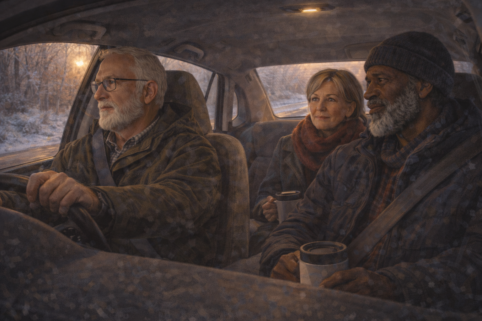 Jeremiah sat in the passenger seat, knit cap pulled down to his eyebrows, shoulders broad inside his heavy jacket. He watched the road the way he watched people—not suspicious, just attentive. His beard, salt-and-pepper with more gray than not, moved slightly when he hummed under his breath, a tune with no words. It sounded like something he’d heard long ago and never entirely put down.