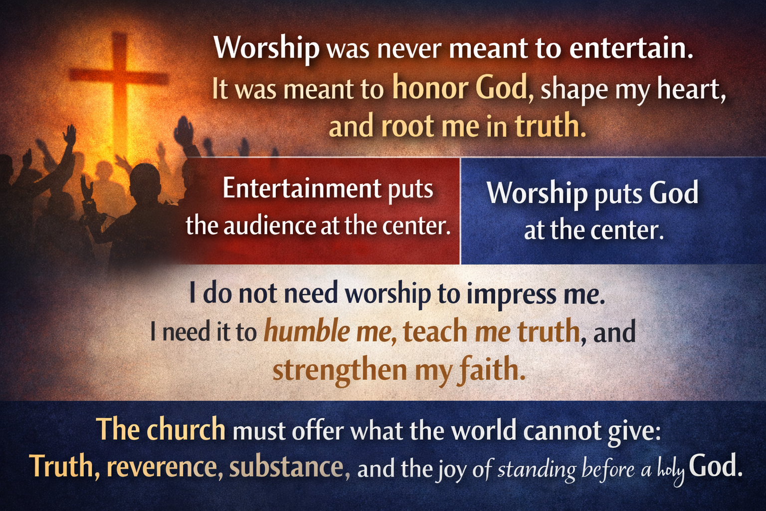That is why I believe the church must resist a consumer approach to worship. Entertainment asks what I got out of the experience. Worship asks whether God was honored according to His will. Entertainment trains me to expect constant intensity. Worship teaches me submission, patience, and attentiveness. Entertainment puts the audience at the center. Worship puts God at the center. Those two ways of thinking are not merely different preferences. They come from fundamentally different worldviews.